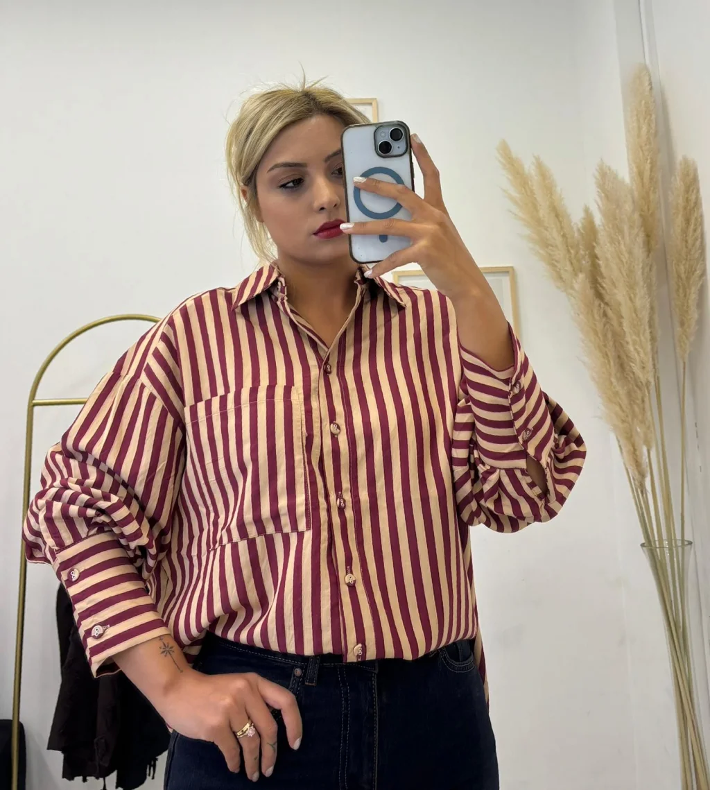 Oversize Dikey Çizgili Poplin Gömlek - Bordo Krem, klasik gömlek formunu modern ve rahat oversize kesimiyle birleştirir. Canlı renk kontrastı ve dikey çizgileri sayesinde güçlü bir stil beyanı sunar.