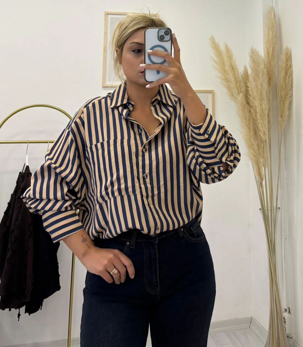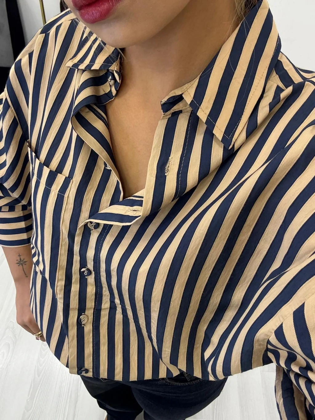 Oversize Dikey Çizgili Poplin Gömlek - Lacivert Bej