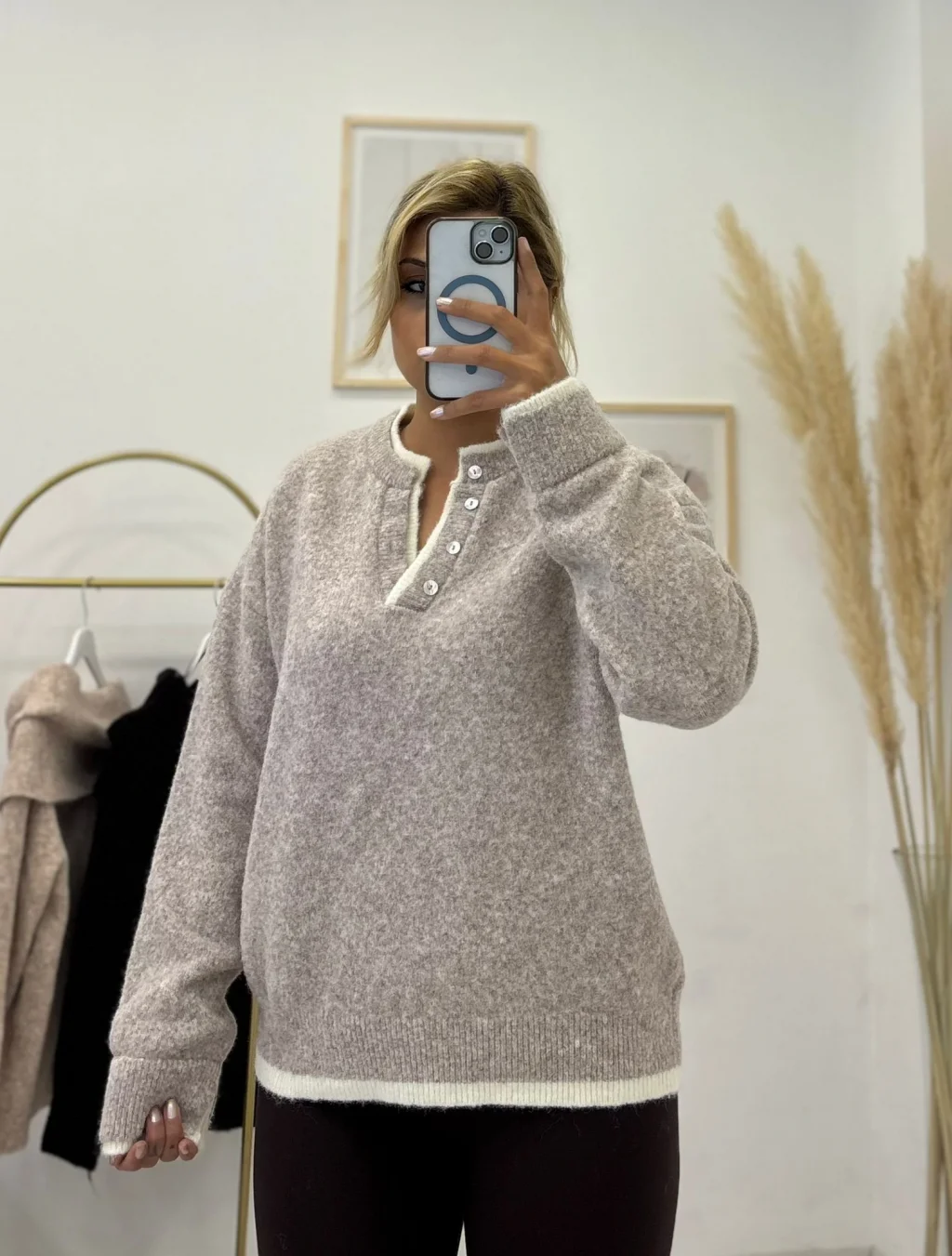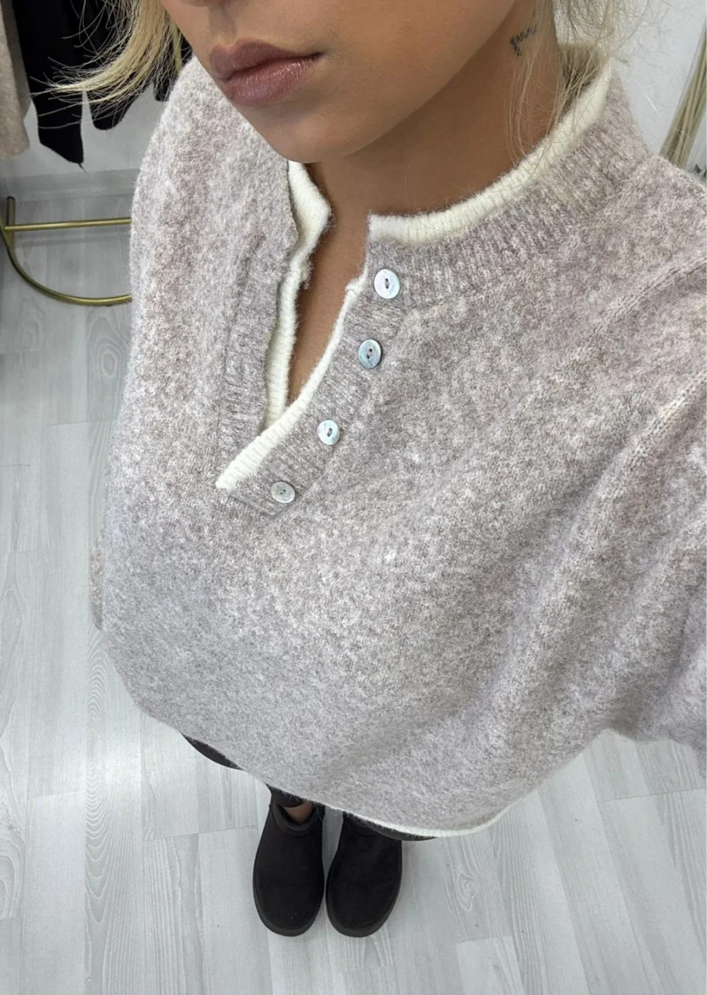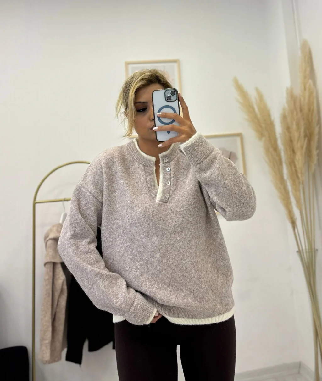 Oversize Düğmeli Henley Yaka Basic Triko Kazak - Bej/Ekru, rahat ve sportif bir şıklık sunar. Melanj dokulu bej rengi, yakadaki ekru kontrastı ve düğme detayıyla sade parçalara hareket katar.