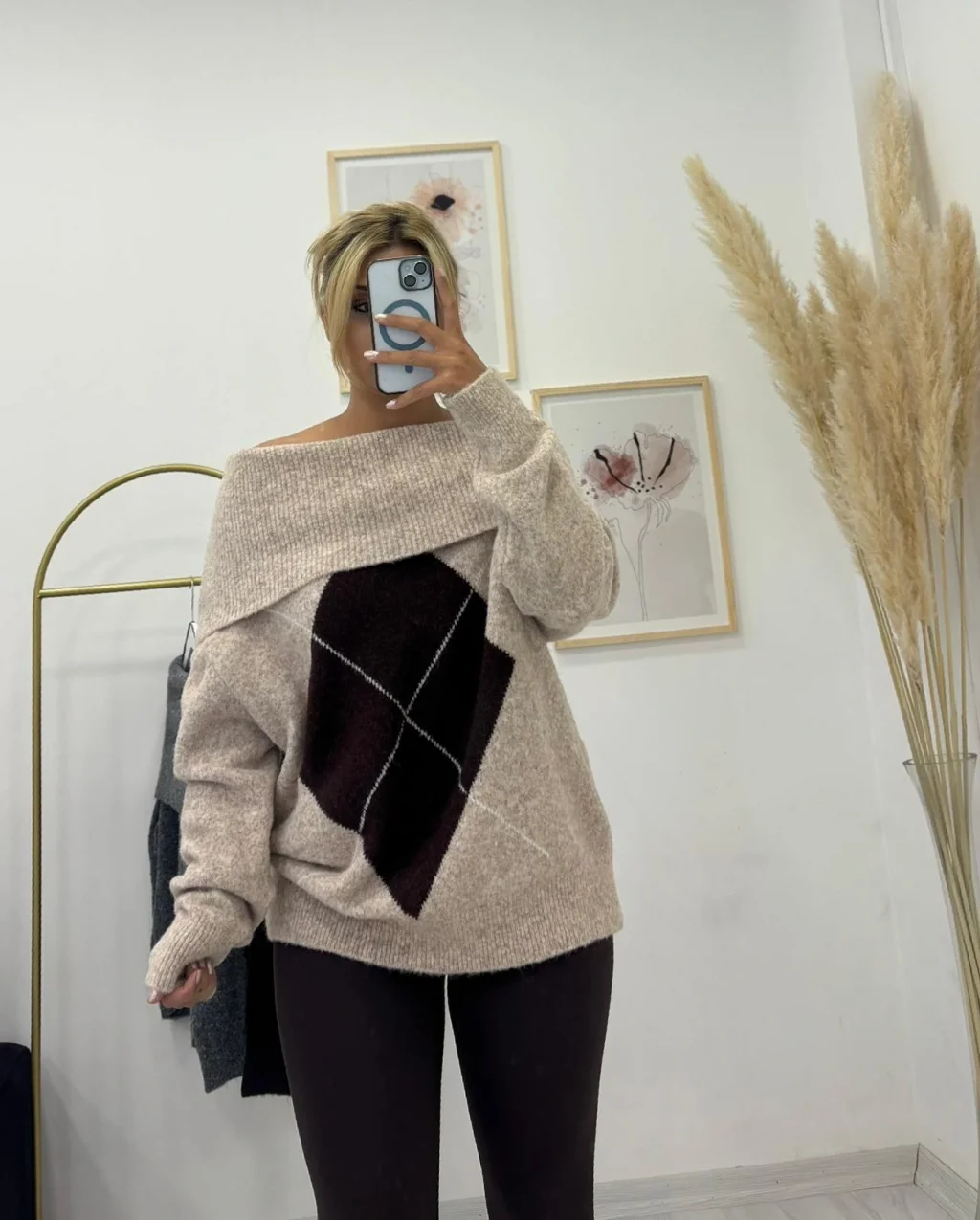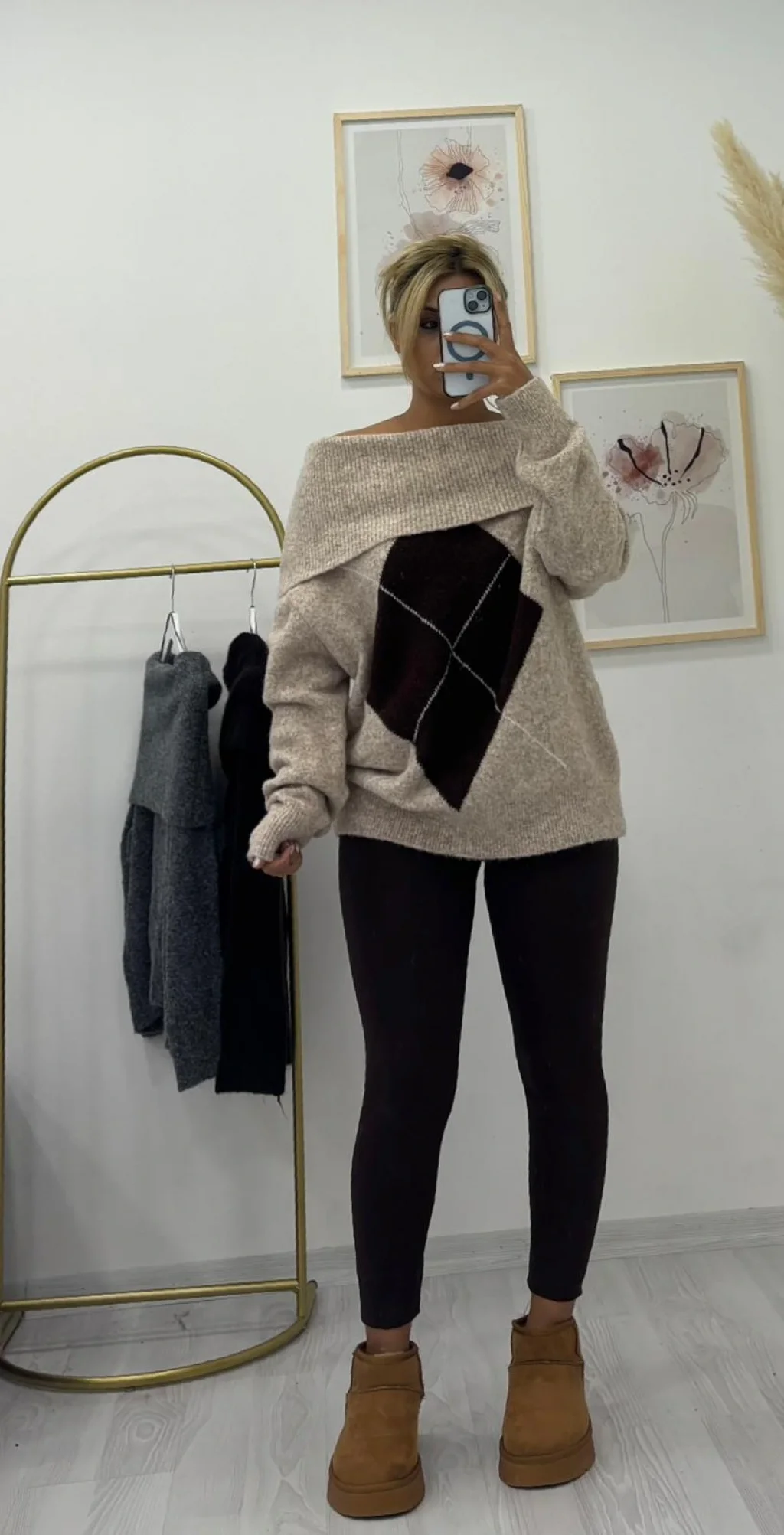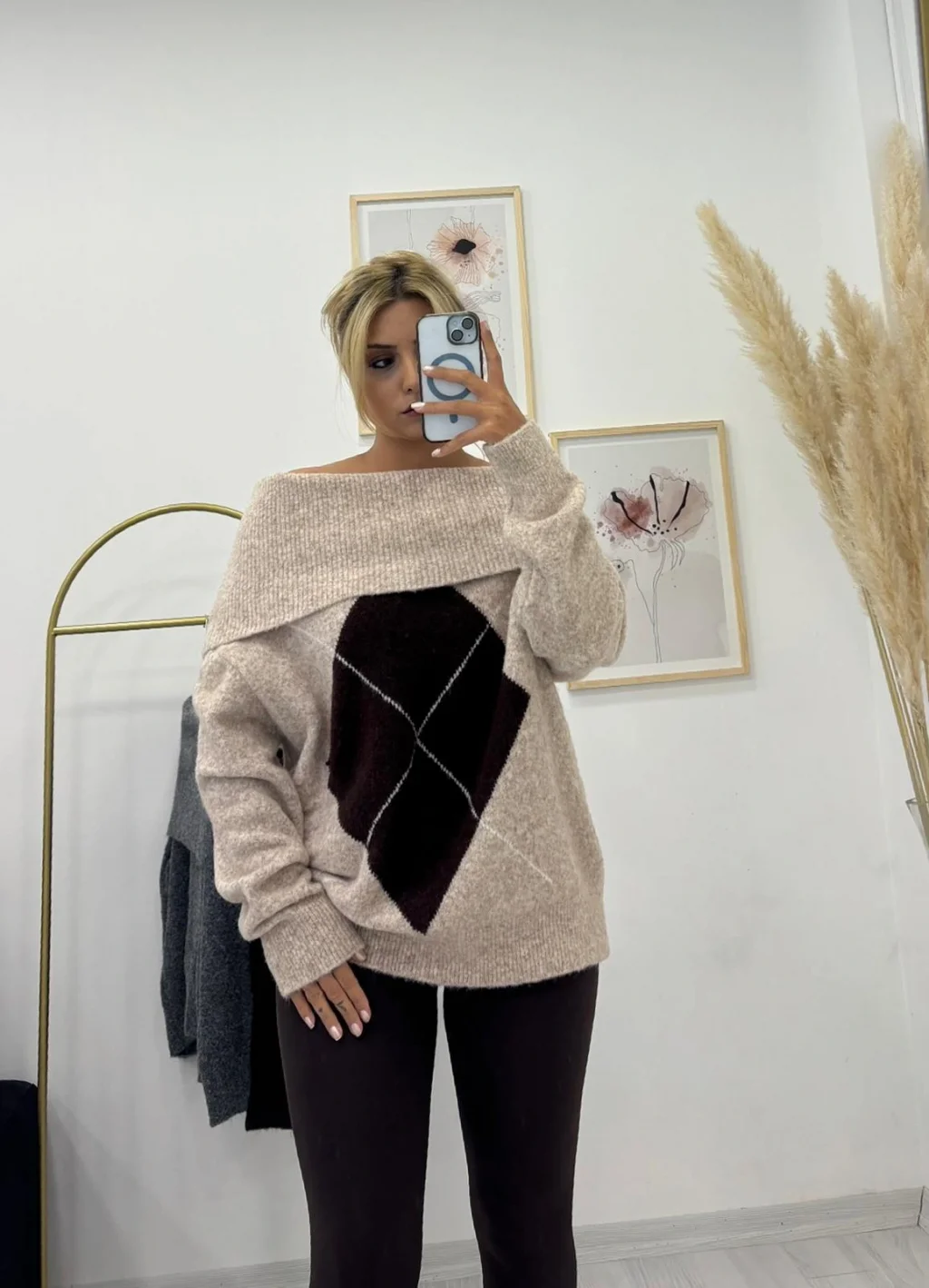 Kalın ve yumuşak triko ipliğiyle örülmüş, nötr Açık Bej ana zemin üzerinde koyu bordo/kahverengi baklava (argyle) deseni bulunan kazak. Oversize (bol) kesimi ve geniş, düşük omuzlu yakasıyla modern, sıcak ve dökümlü bir stil sunar