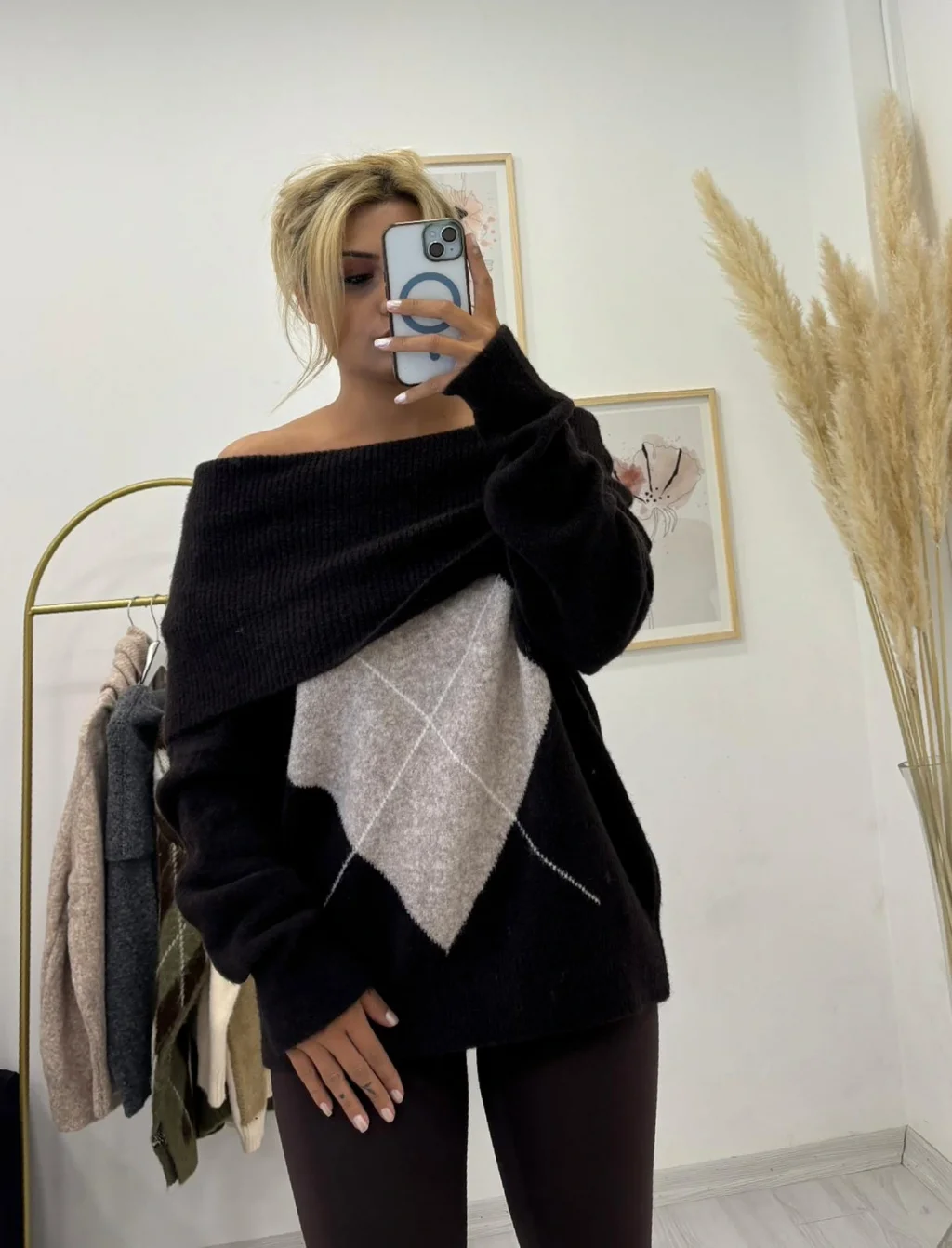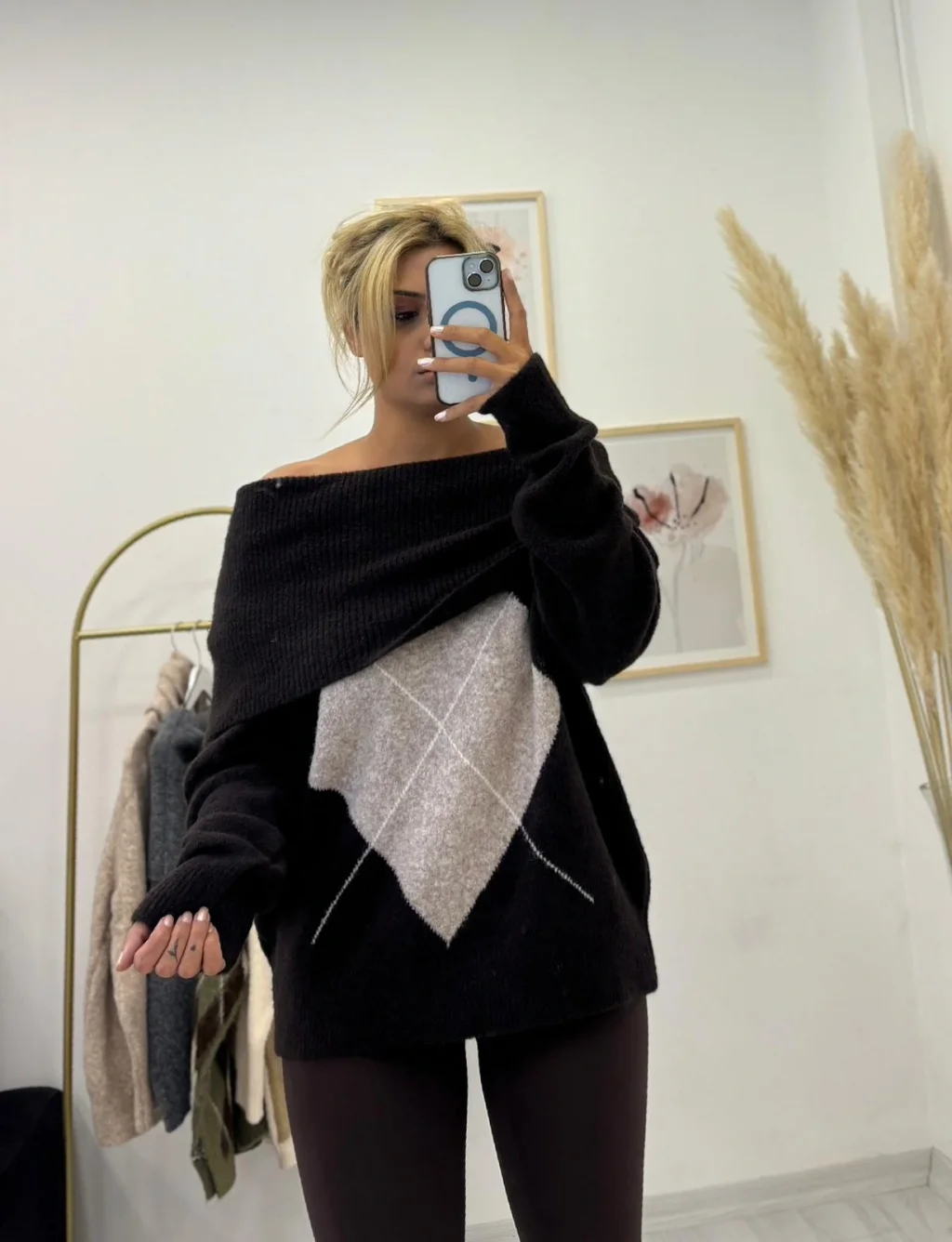 Oversize Düşük Omuzlu Baklava Desenli Triko Kazak - Koyu Kahverengi, İngiliz stili baklava (argyle) desenini, modern ve rahat bir kesimle birleştirir. Dökümlü ve sıcak yapısıyla, şıklık ve konforu bir arada sunar.