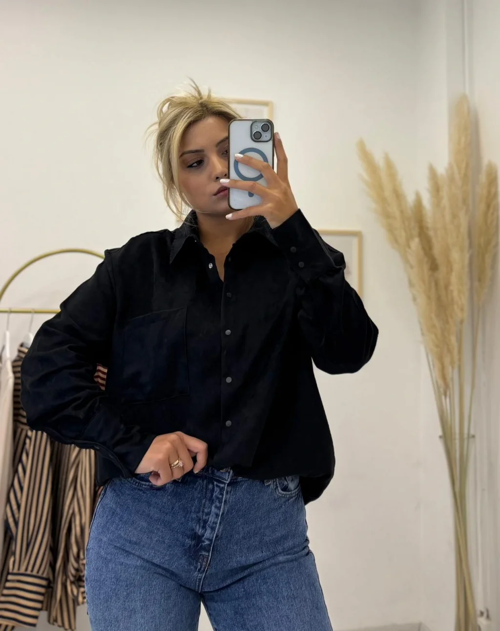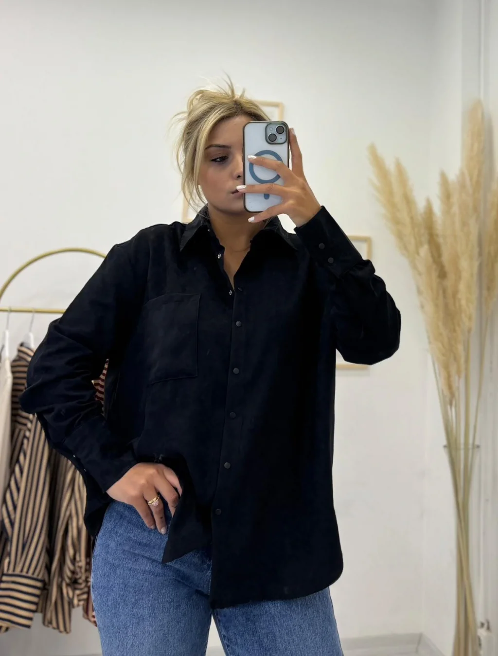 Yumuşak dokulu ve tok duruşlu, süet hissiyatına sahip kumaştan üretilmiş, oversize (bol kesimli) Siyah gömlek. Tek cepli modern tasarımıyla hem gömlek hem de mevsimlik gömlek ceket (shacket) olarak kullanıma uygundur.