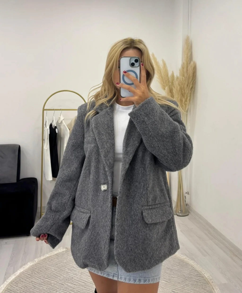 Oversize Tek Düğmeli Tüylü Kaşe Ceket, klasik blazer şıklığını kışlık kaban konforuyla birleştiriyor. Yumuşak ve kalın tüylü (muhtemelen bukle yün veya yün karışımı) kumaşı, soğuk günlerde üstün sıcaklık ve stil sağlar.