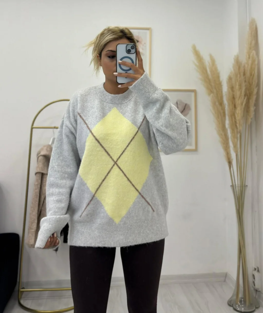 Kalın ve yumuşak triko ipliğiyle örülmüş, nötr Açık Gri ana zemin üzerinde göz alıcı sarı (limon/açık bej) tonlarında baklava (argyle) deseni bulunan kazak. Oversize (bol) kesimi ve kalın yüksek/bisiklet yaka kesimiyle enerjik, sıcak ve dökümlü bir stil sunar.