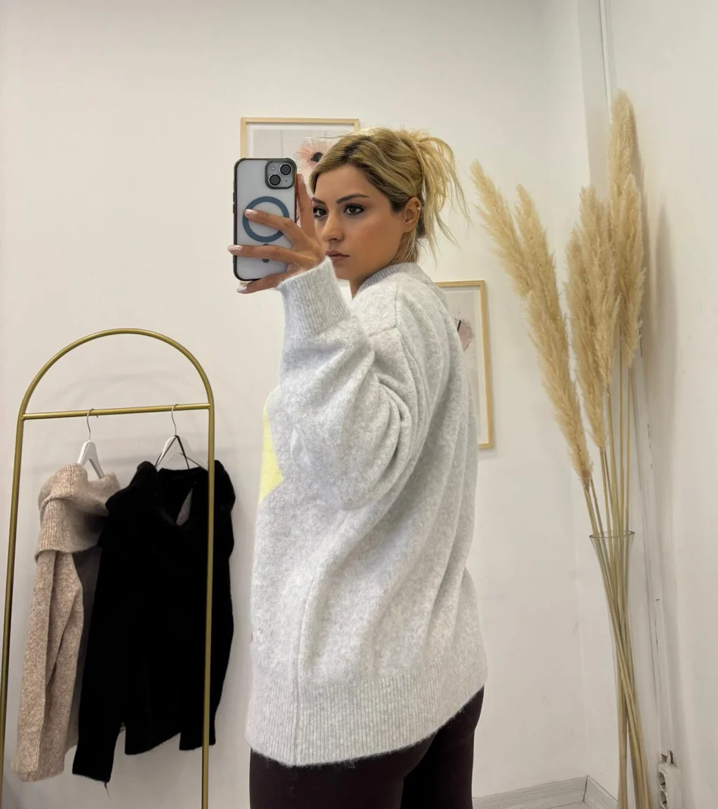 Oversize Yüksek Yaka Baklava Desenli Triko Kazak - Gri/Sarı, nötr gri zemini modern sarı deseniyle hareketlendirir. Yumuşak tuşesi ve canlı renk kontrastıyla kış günlerine enerji katacak bir parçadır.