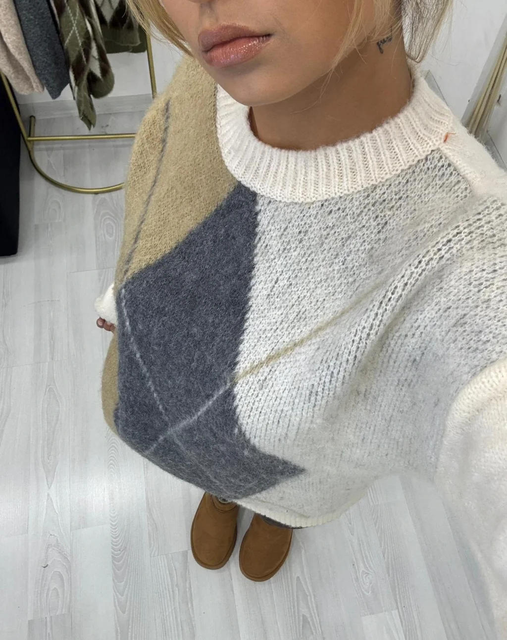 Oversize Yüksek Yaka Baklava Desenli Triko Kazak - Krem/Camel/Gri, klasik argyle desenini nötr ve zarif renk tonlarıyla yeniden yorumlar. Bej, krem ve grinin sofistike uyumuyla kolay kombinlenen, şık ve sıcak bir kış parçasıdır.