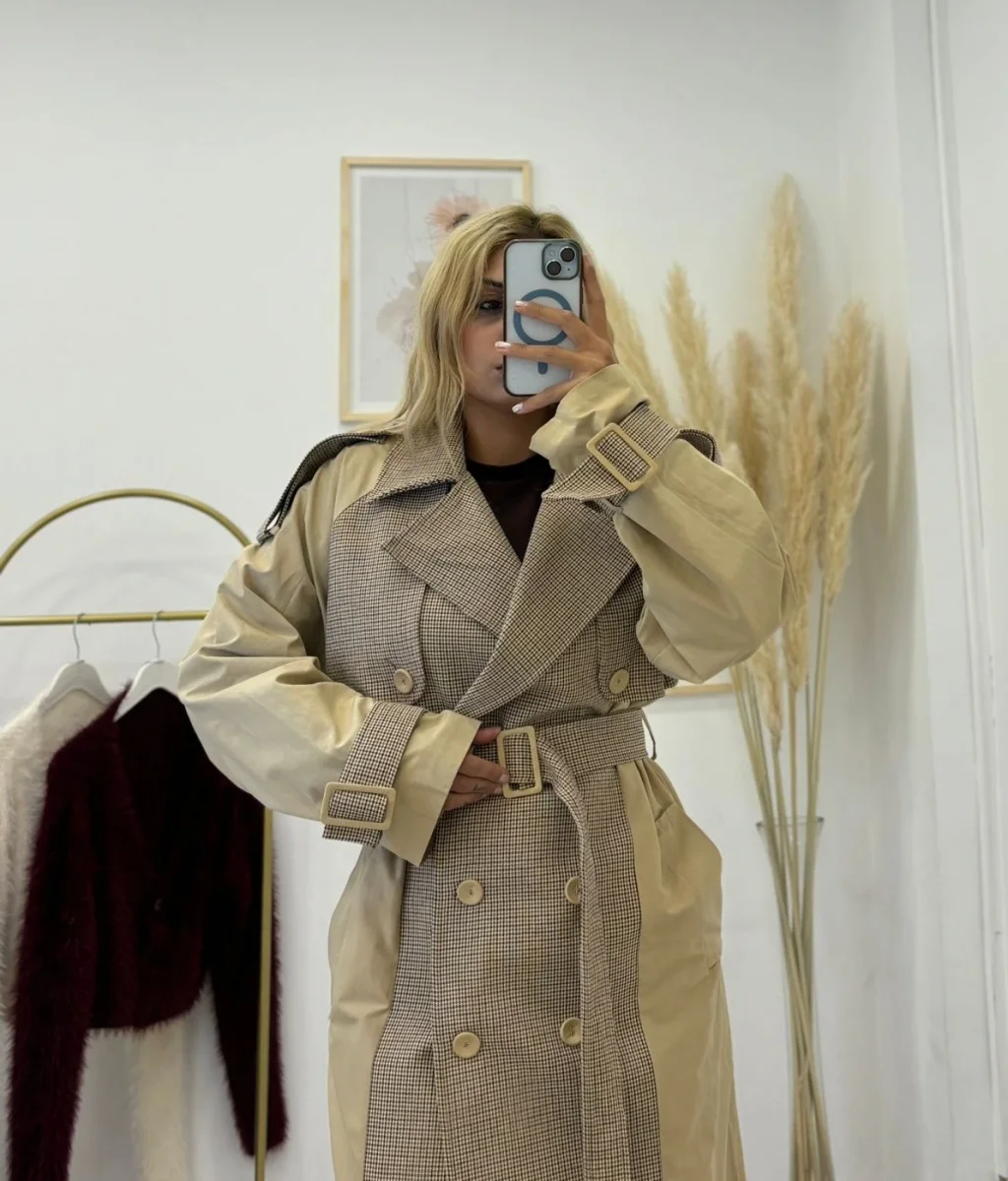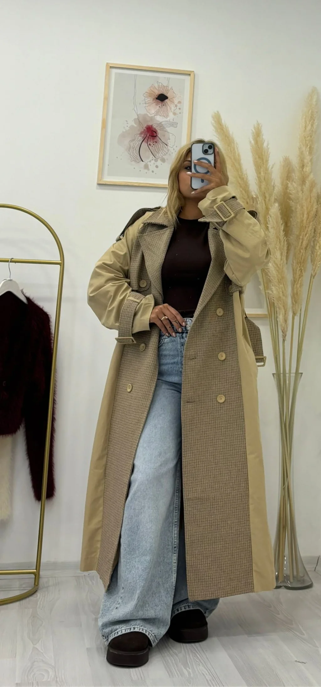 Kombin Detayı: Trençkotun gövdesi ve yakası; klasik bej/haki rengi düz kumaş ile kahverengi tonlarında şık ekose/mikro desenli kumaşın (patchwork görünümü) ustaca birleşimiyle oluşturulmuştur. Bu kombinasyon, ceketi eşsiz kılar.