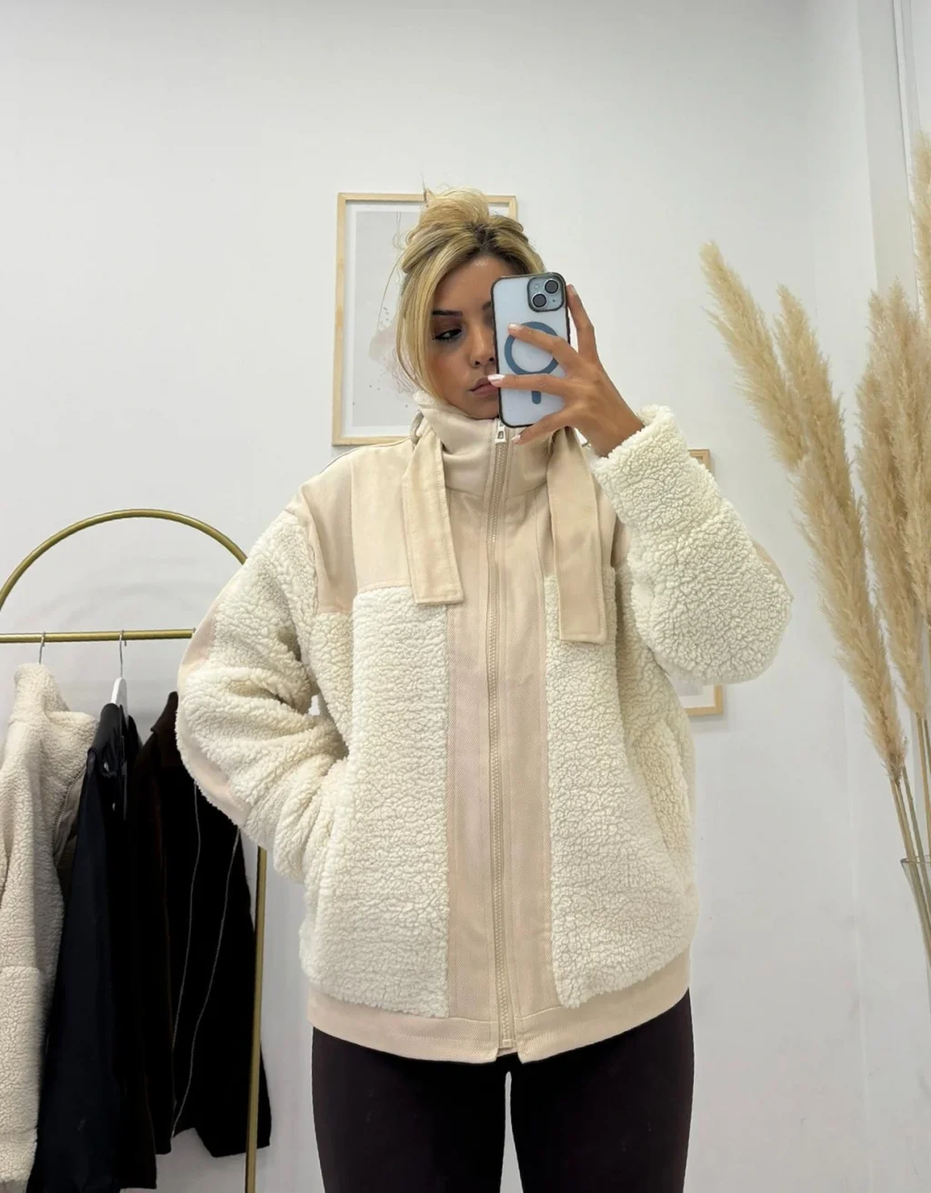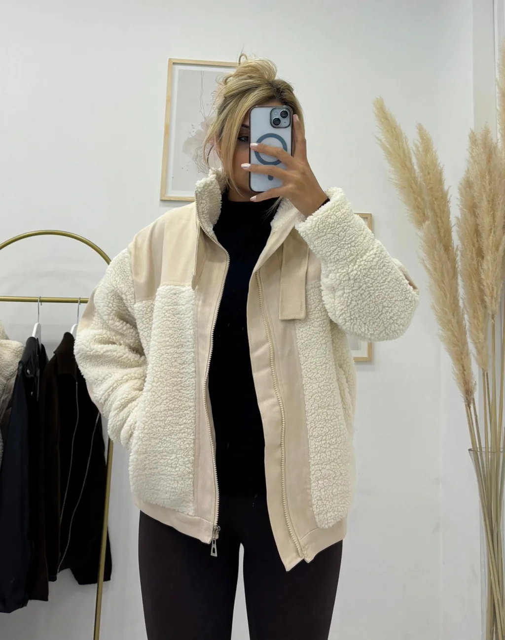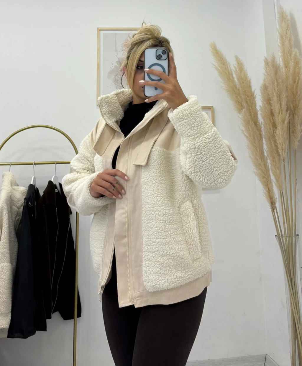 Kalın ve sıcak tutan, iki farklı dokuyu birleştiren şık ceket. Gövde kısmı pofuduk Peluş (Teddy) kumaştan, ön ve omuz detayları ise düz, tok görünümlü kontrast kumaşla yapılmıştır. Dik yakalı ve tam boy fermuarlıdır. Ana renkler Ekru ve Açık Bej'dir.
