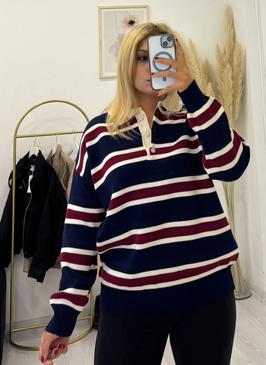 Polo Yaka Çizgili Oversize Triko Kazak ile spor şıklığı ve üstün konforu birleştirin. Kalın ve yumuşak triko iplikten üretilen bu kazak, kış aylarında sıcaklık ve rahatlık sunar. Rahat ve geniş (oversize) kesimi, hareket özgürlüğü sağlarken modern bir görünüm yaratır. Kontrast renkteki (beyaz) klasik polo yaka ve ön kısmındaki düğme detayı, ürüne sportif ve zarif bir hava katar. Kahve ve beyaz renkli kalın çizgili deseni, kolayca kombin yapılmasına olanak tanır. Tayt, jean veya deri pantolonlarla mükemmel bir uyum sağlayarak günlük stilinizi tamamlar."