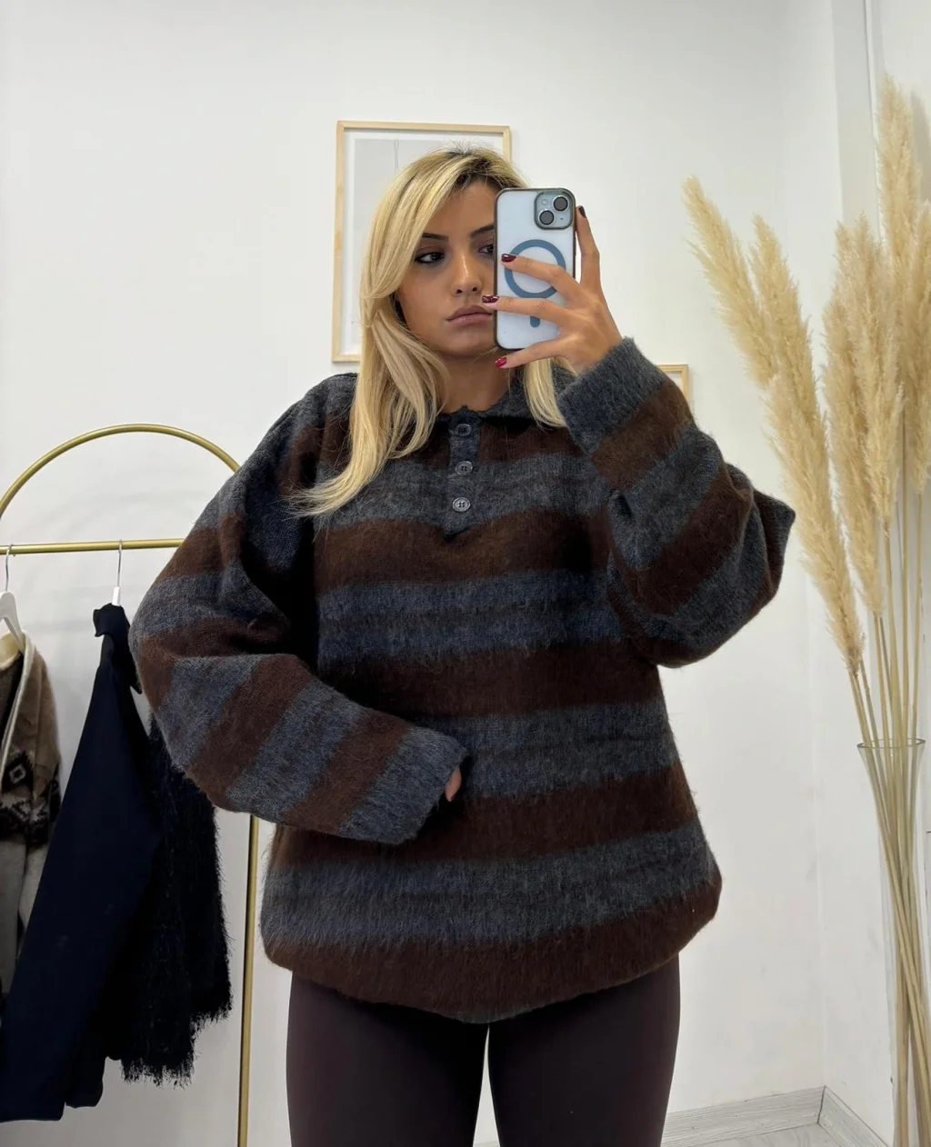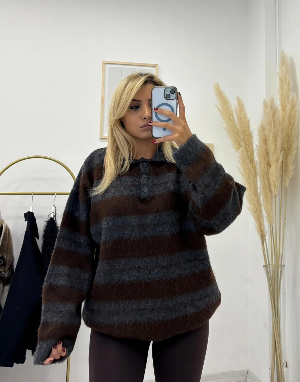 Yumuşak, sıcak tutan ve pofuduk tüylü (shaggy) dokuya sahip oversize triko kazak. Klasik polo yaka ve önü üç düğmeli detaylara sahiptir. Koyu Kahve ve Antrasit Gri çizgilerinden oluşur.