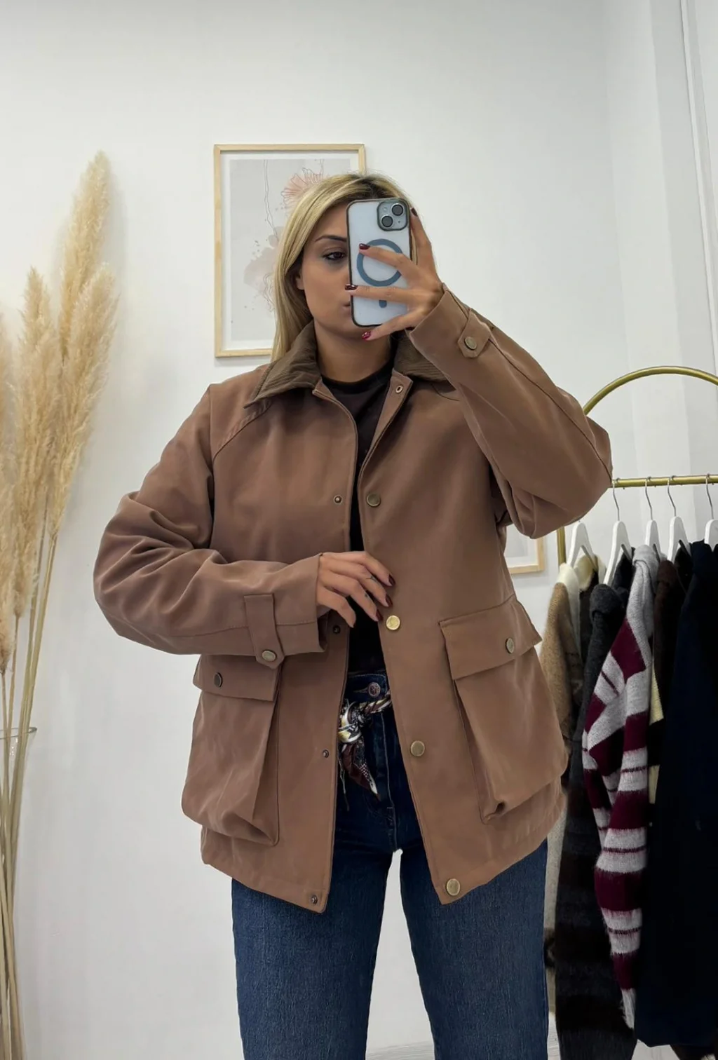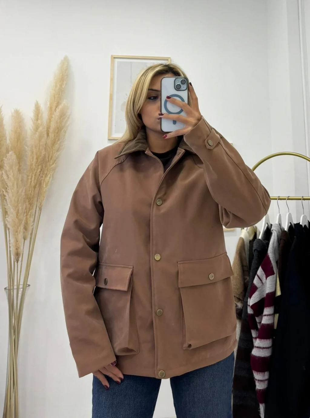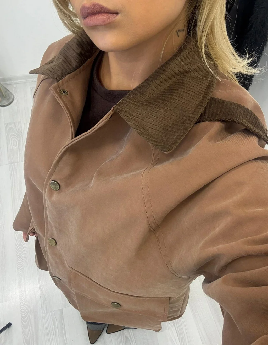 Tok, kalın ve mat kumaştan yapılmış, safari/field stilinde şık dış giyim parçası. Klasik safari gömlek yakası, kontrast Korduroy (Fitilli Kadife) detaylıdır. Dört adet kapaklı cebi ve parlak Gold (Altın) rengi metal düğmeleri bulunur. Rengi trend Taba/Açık Kahve tonlarındadır.