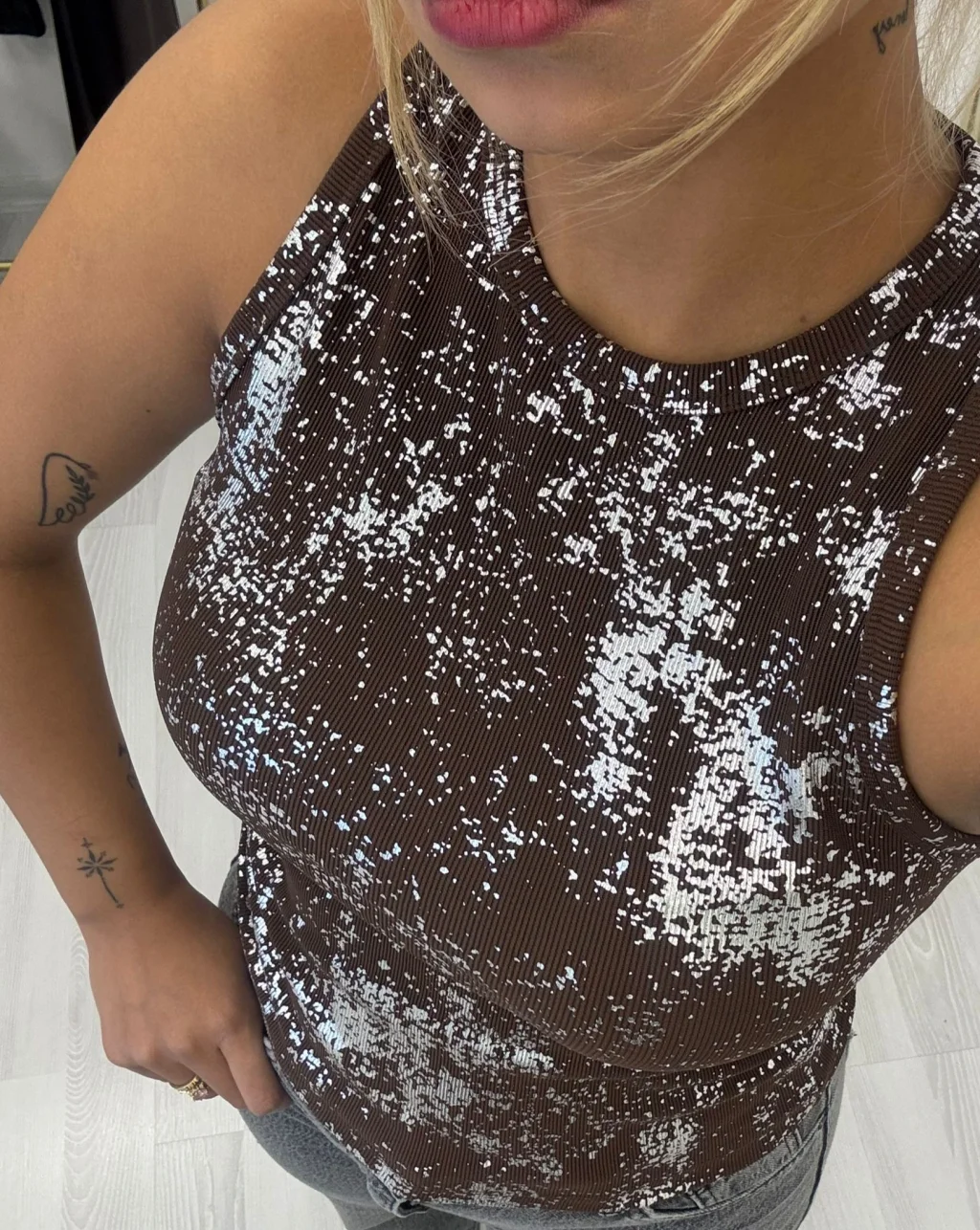 Sıcak kahverengi zemin üzerinde gümüş tonlarında soyut desenlerle tasarlanmış, kolsuz bluz/atlet. Kumaşındaki belirgin simli/ışıltılı doku sayesinde gece ve şık kombinler için idealdir. Bisiklet yaka ve fit kesim