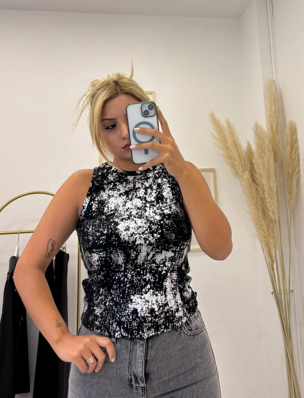 Simli Abstrakt Desenli Kolsuz Bluz/Atlet, siyahın derinliği ile gri/gümüş ışıltılarını dinamik soyut desenlerle buluşturarak modern ve iddialı bir görünüm sunar. Özel davetler, akşam yemekleri ve şık etkinliklerde tüm gözleri üzerinize çekecektir.