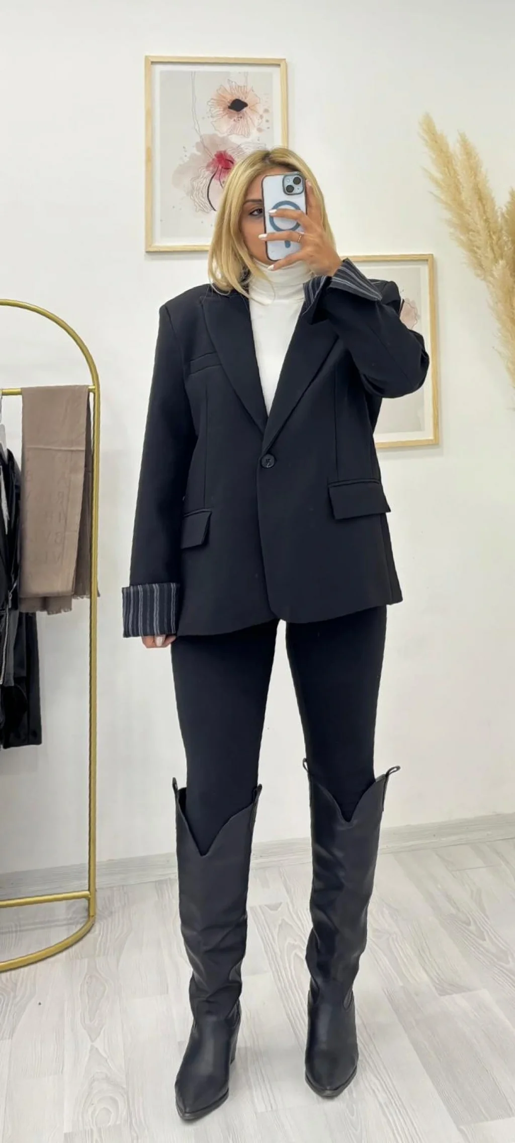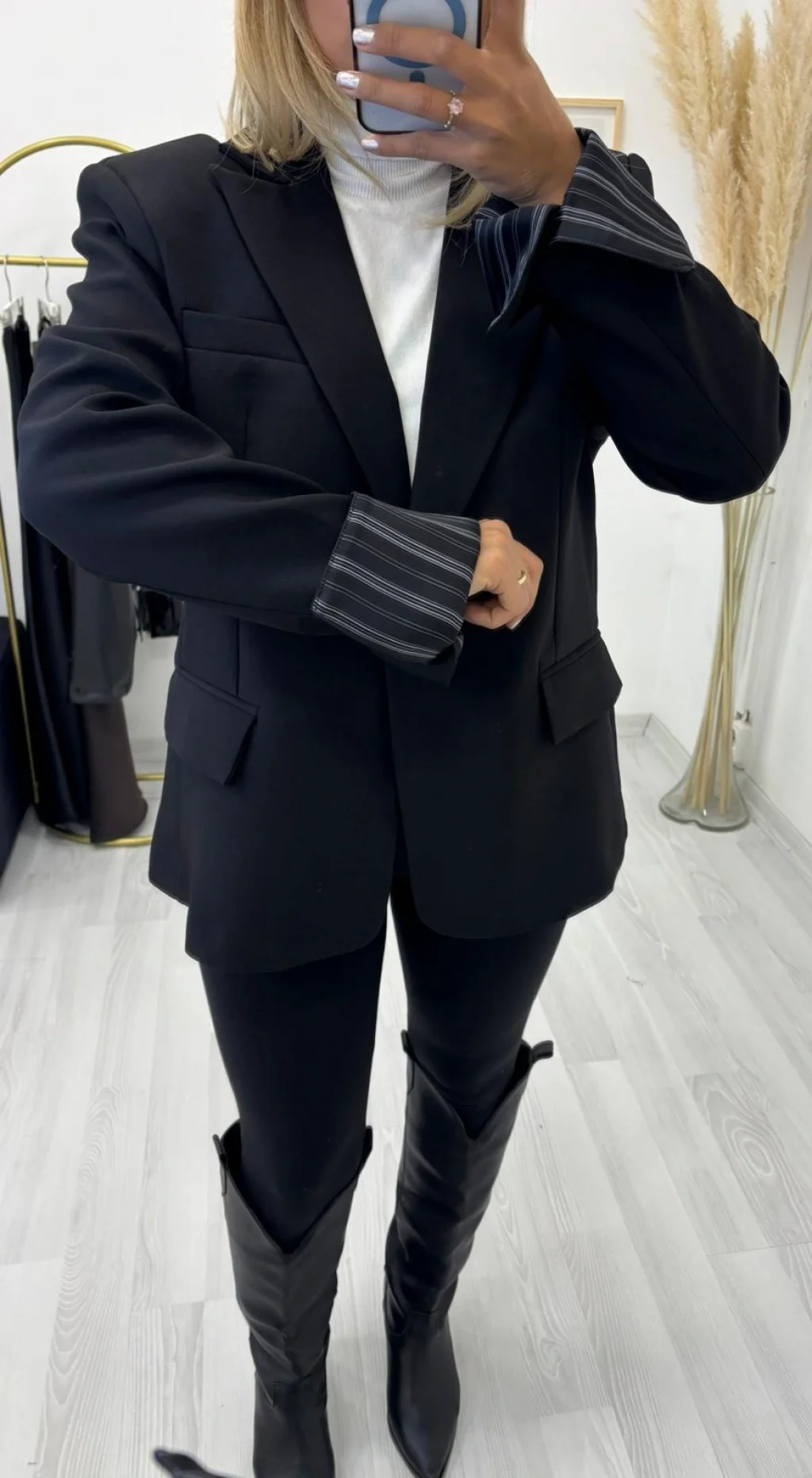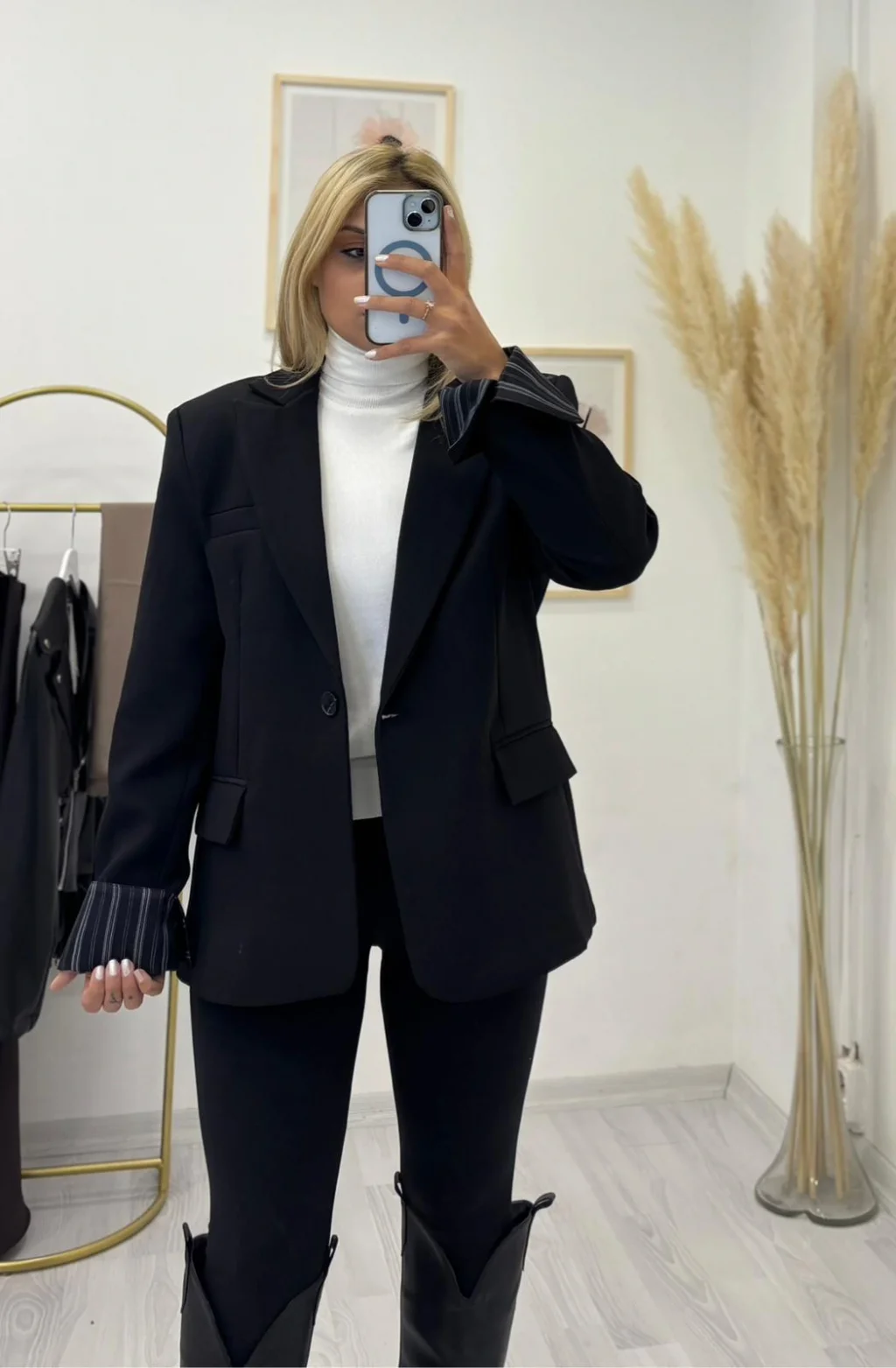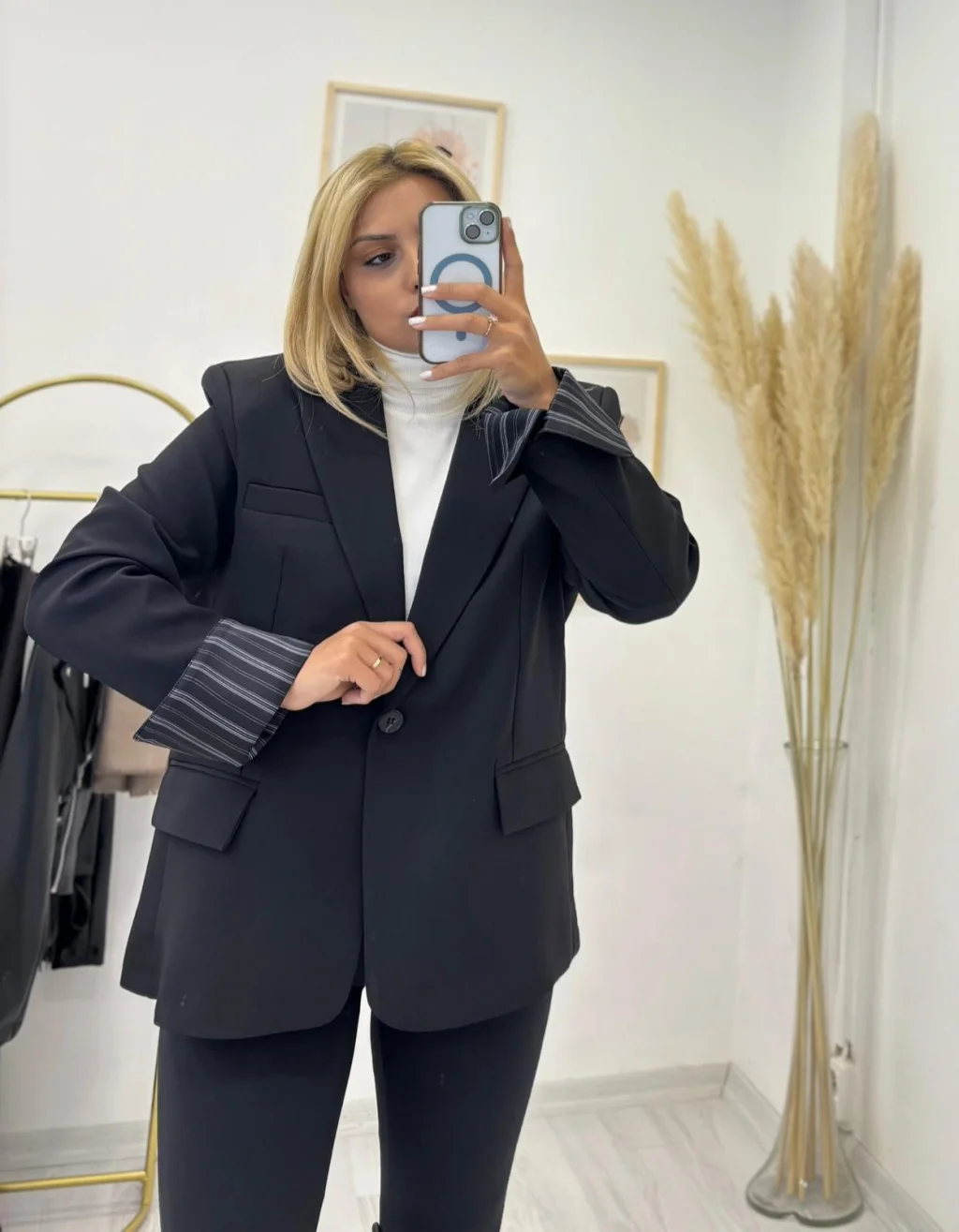 Tok duruşlu kumaştan üretilmiş, oversize (bol kesimli),uzun ve klasik Siyah Blazer Ceket. Tek düğmeli kapama ve katlanarak kullanılan çizgili kol astarı detayıyla modern ve sofistike bir stil sunar. Ofis ve günlük şıklık için idealdir.