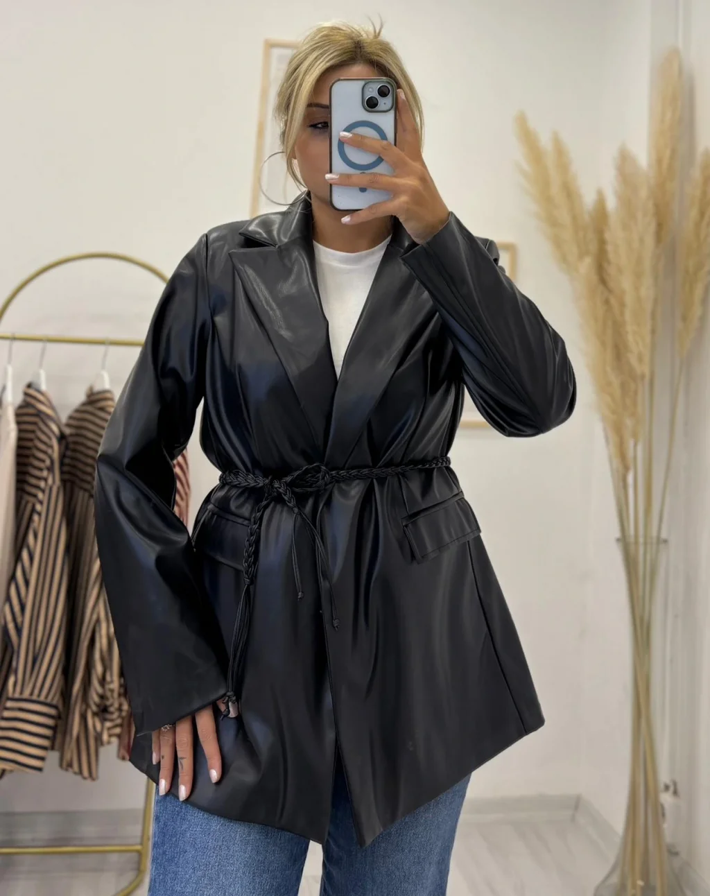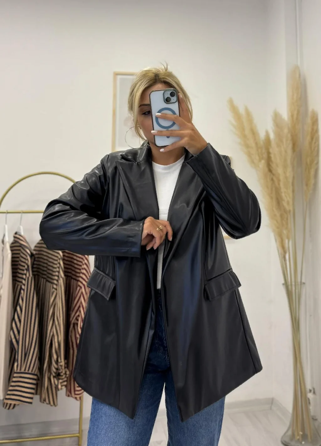 Siyah Kuşaklı Deri Görünümlü Oversize Blazer Ceket, klasik blazer şıklığını vegan derinin asi ve modern duruşuyla birleştiriyor. Sonbahar-kış aylarının en iddialı ve zamansız dış giyim parçalarından biridir.