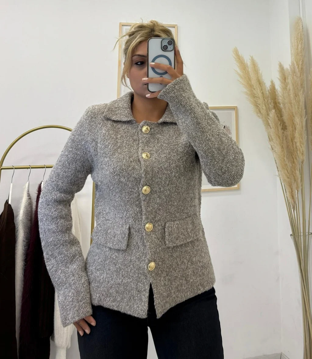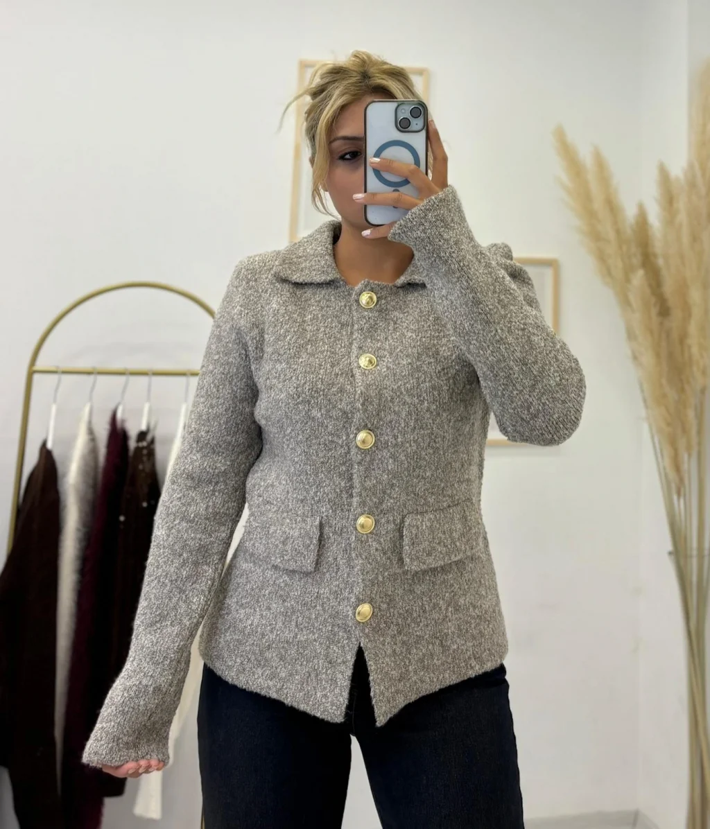Tüvit (Buklet) Görünümlü Altın Düğmeli Triko Ceket/Hırka, sofistike bir doku ile triko rahatlığını buluşturuyor. Açık melanj rengi, parlak altın düğmeleri ve vücuda oturan fit kesimiyle klasik bir blazer havası taşır.