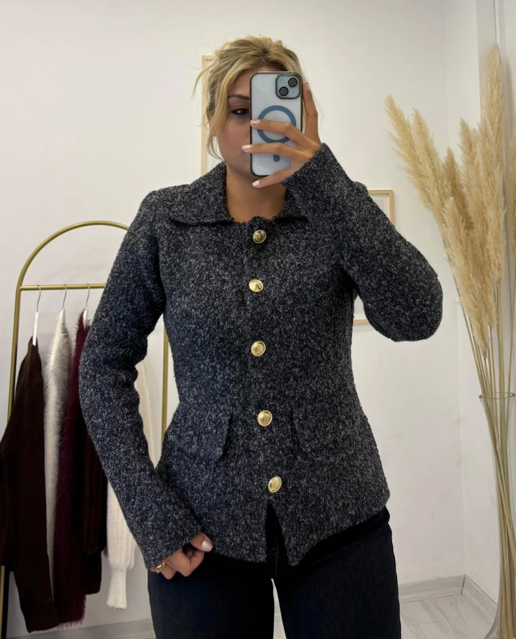 Tüvit (buklet) dokusu ve fit kesimiyle blazer şıklığı sunan triko ceket/hırka. Klasik yakası, gold düğmeleri ve Antrasit Melanj rengiyle sofistike ve modern bir stil yaratır