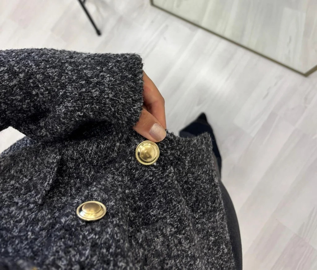 Tüvit (Buklet) Görünümlü Altın Düğmeli Triko Ceket, triko konforunu Chanel tarzı klasik bir ceket şıklığıyla birleştirir. Dokusu ve metal düğme detayı sayesinde kombinlerinize hemen sofistike bir hava katar.