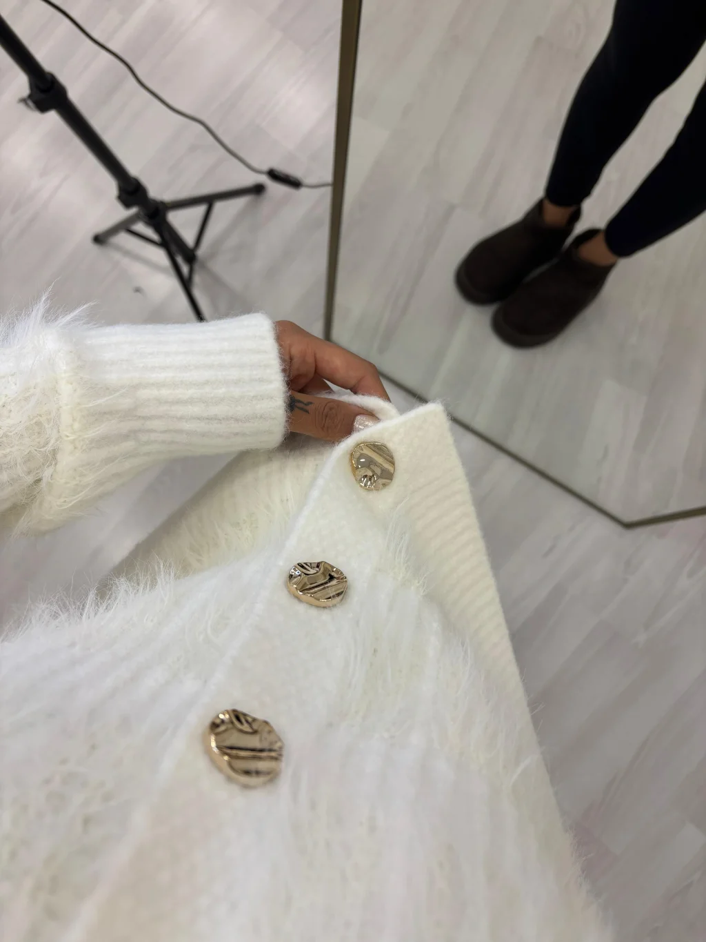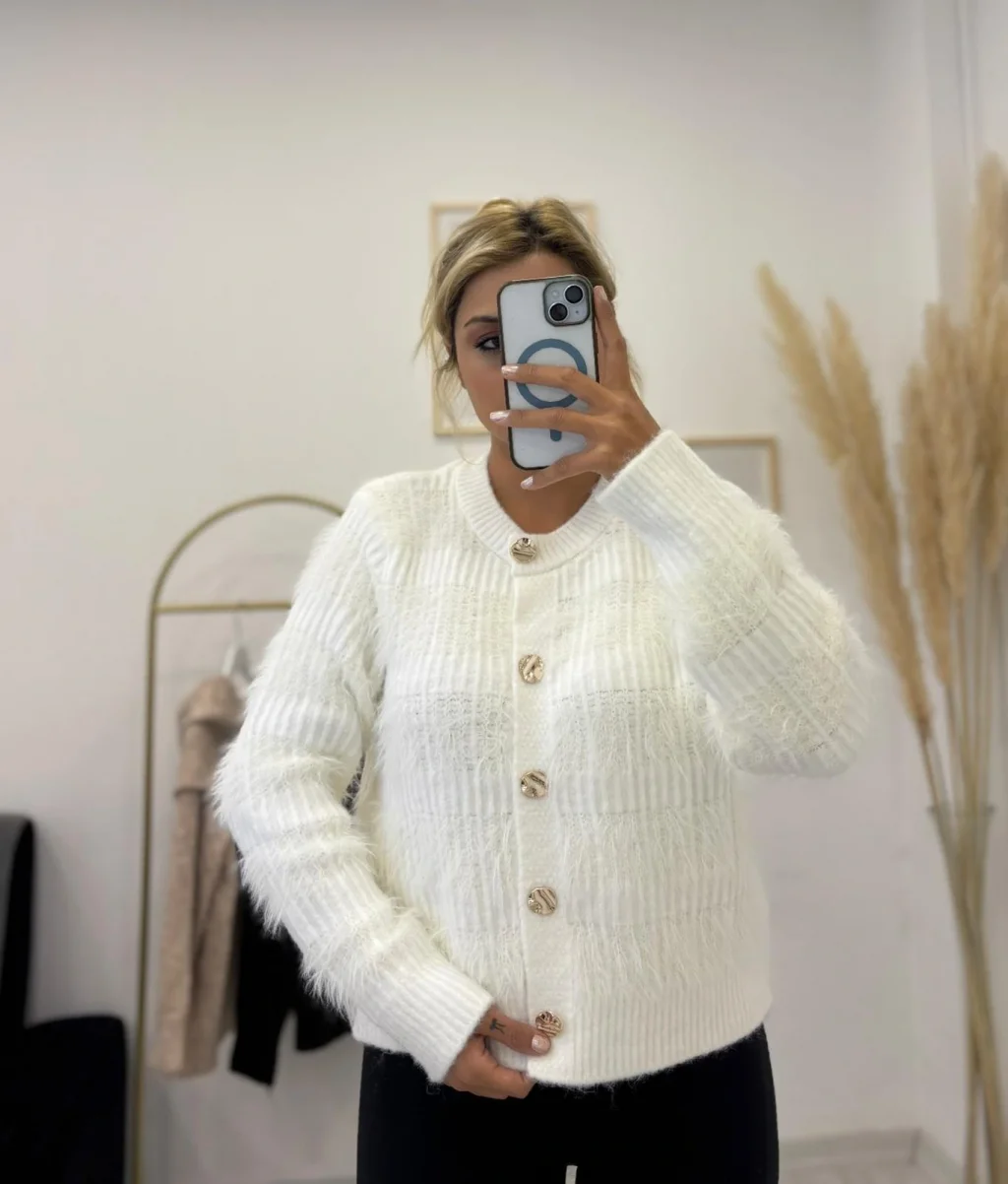 Tüylü Shaggy Triko Kısa Hırka - Gold Düğmeli Krem, kışlık gardıropların dikkat çekici, lüks parçasıdır. Aydınlık krem rengi, hacimli dokusu ve parlak gold düğme detaylarıyla sofistike ve iddialı bir görünüm sunar.