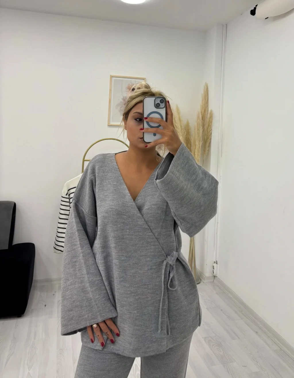 • V Yaka Kuşaklı Örme Triko Takım yumuşak dokulu triko kumaştan, V yaka anvelop üst ve bol paça pantolondan oluşan şık ve rahat kadın takım.