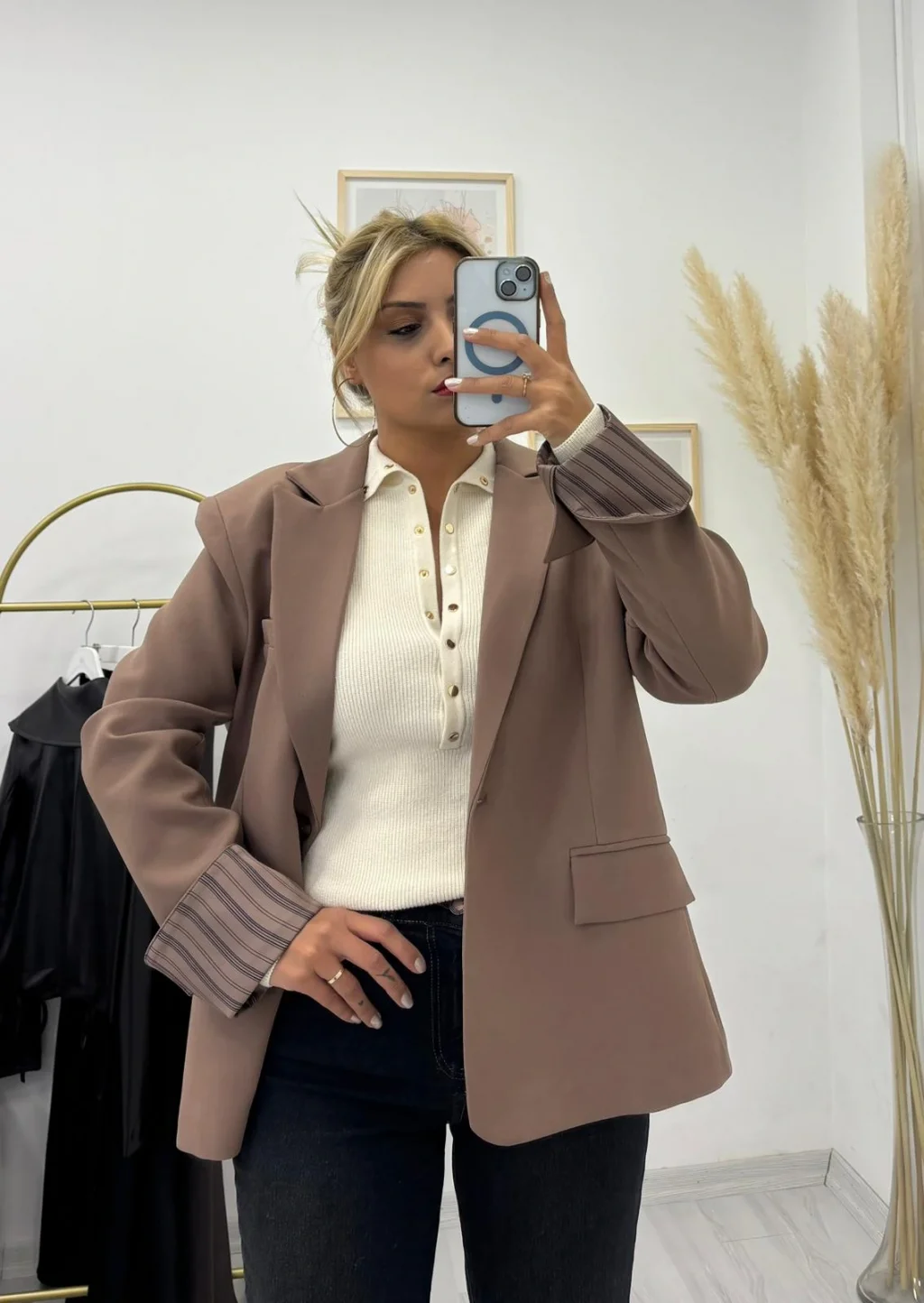 Oversize Tek Düğmeli Çizgili Astarlı Blazer Ceket - Vizon, trend vizon/toprak tonu, bol kesimin rahatlığı ve gizli detayların şıklığı ile ofis ve günlük stilinize sofistike bir dokunuş katar. Sonbahar-kış gardırobunuzun joker parçasıdır.