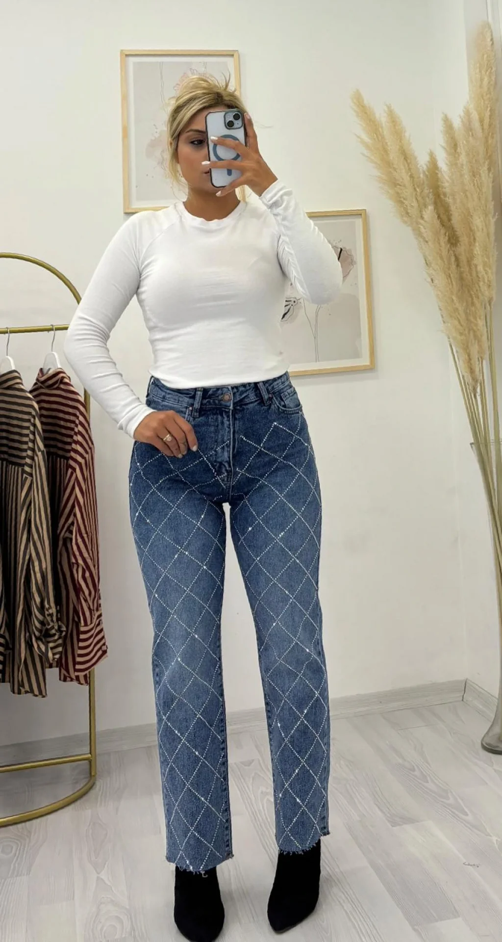 Ürün Adı: Yüksek Bel Taş İşlemeli Baklava Desenli Jean Pantolon