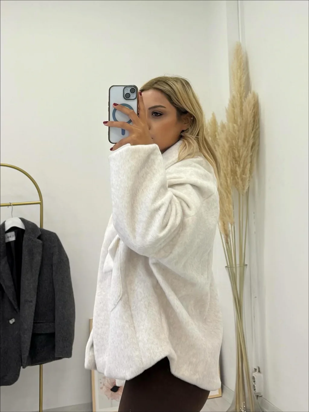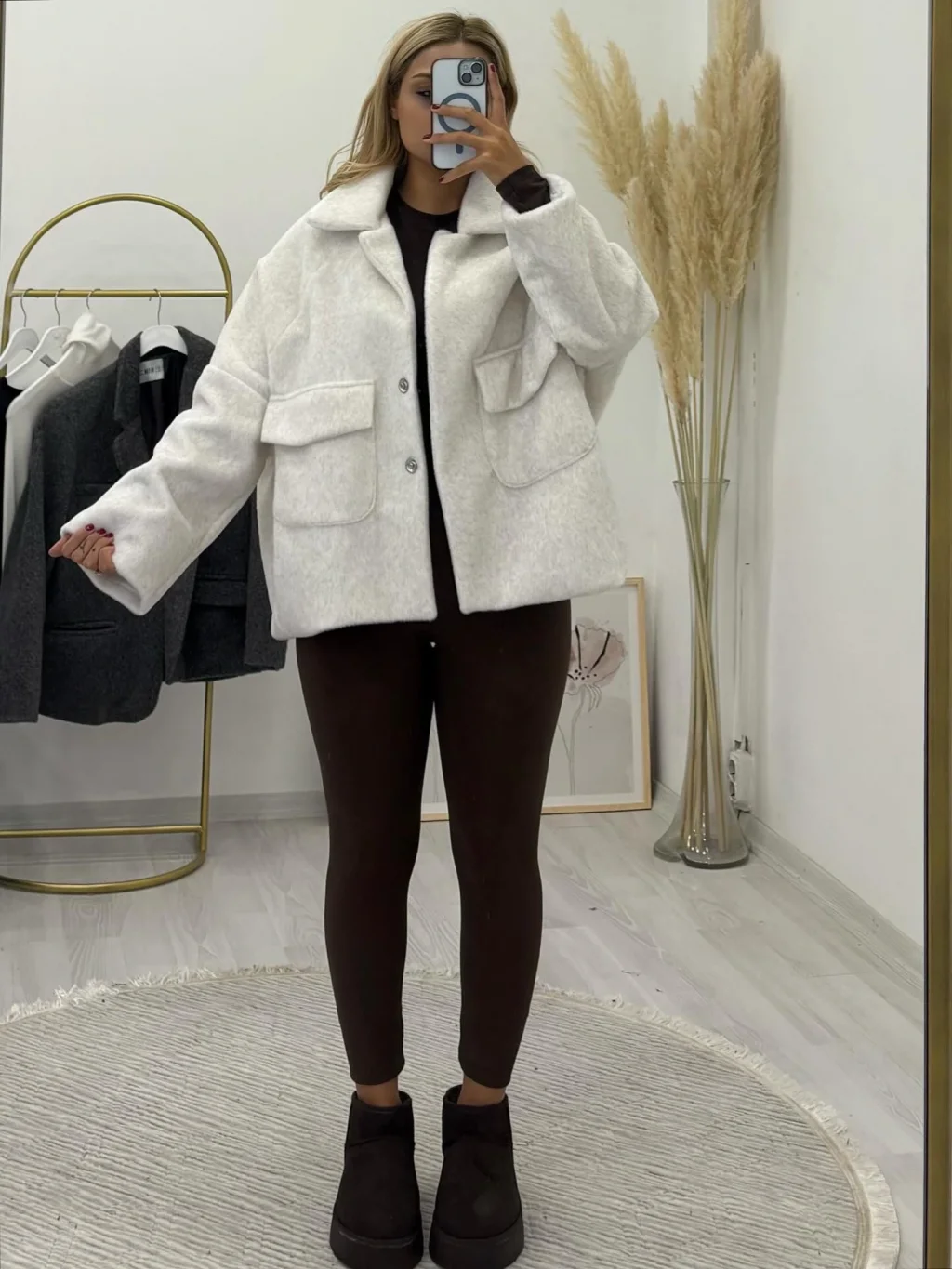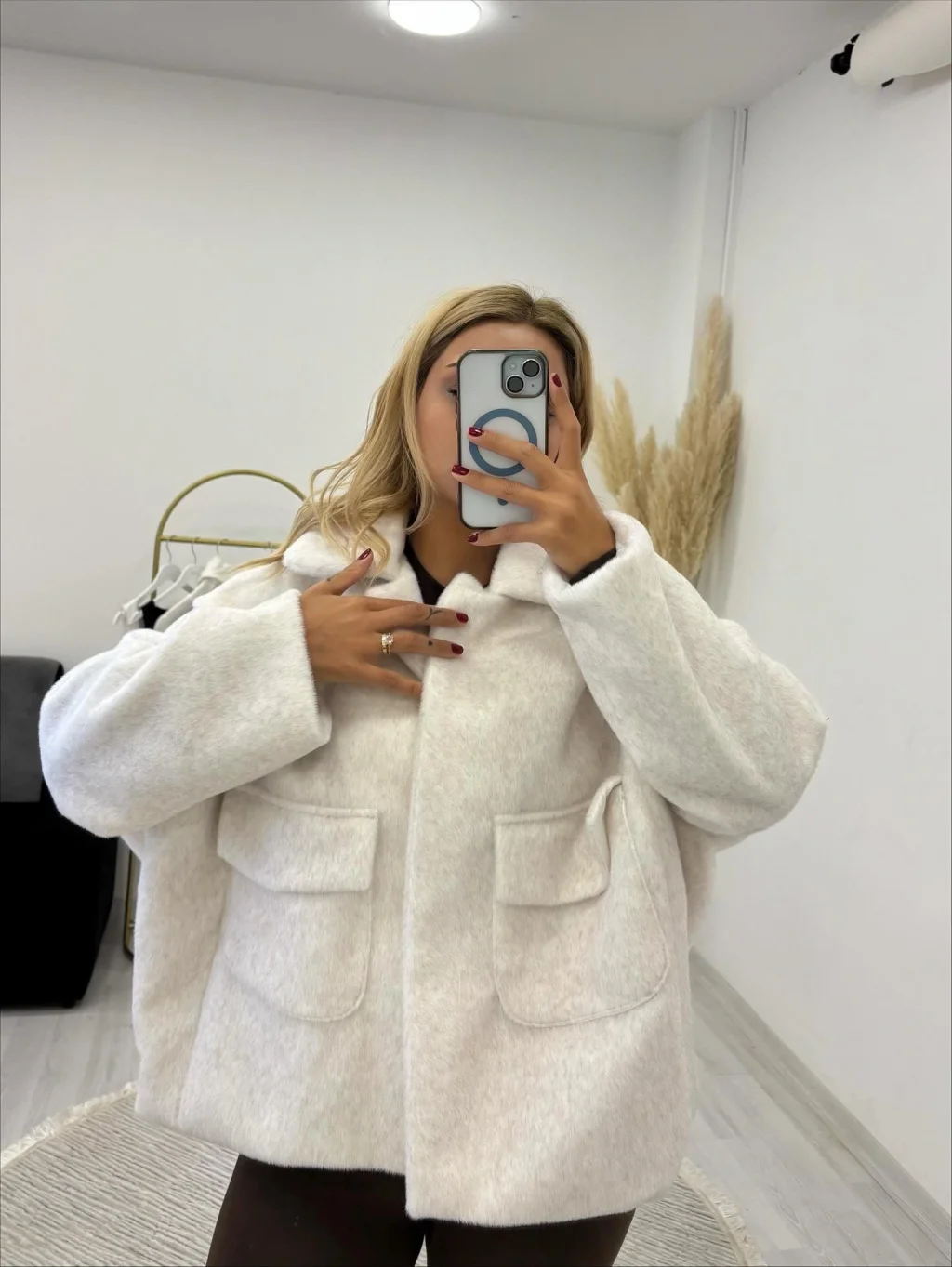 Büyük Yakalı Bukle Kumaş Kısa Mont ile kış ve sonbahar aylarında konfor ve stil bir arada! Yumuşak ve dokulu bukle/peluş kumaşı, ürüne hem lüks hem de sıcak bir görünüm kazandırır.